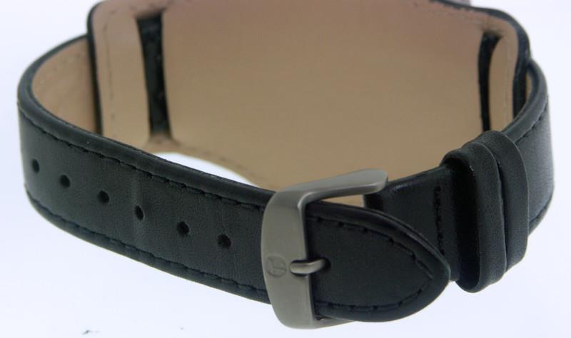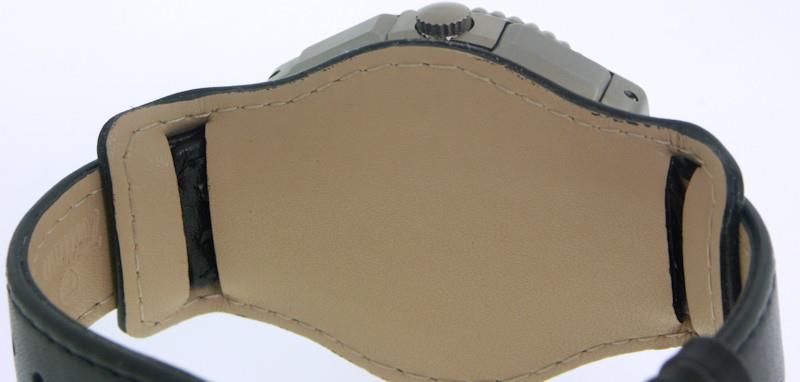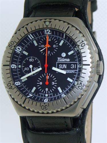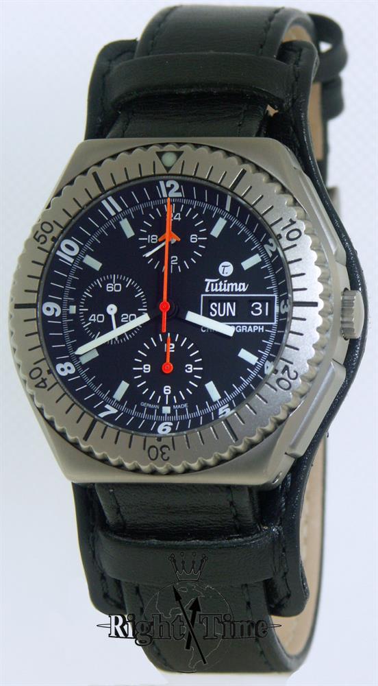 Tutima Military Air Force Chronograph. This watch is powered by famous LEMANIA Cal. 5100 17 jewels Swiss Automatic movement with chronograph, military 24 hour format hand, Day/Date calendar functions. Pure titanium case with screw-down crown and rotating 60 min bezel. Black dial with Arabic numerals, luminous hands and markers. Black leather "Bund" style strap. Water resistant to 200 meters.