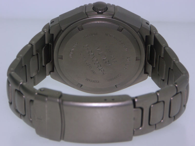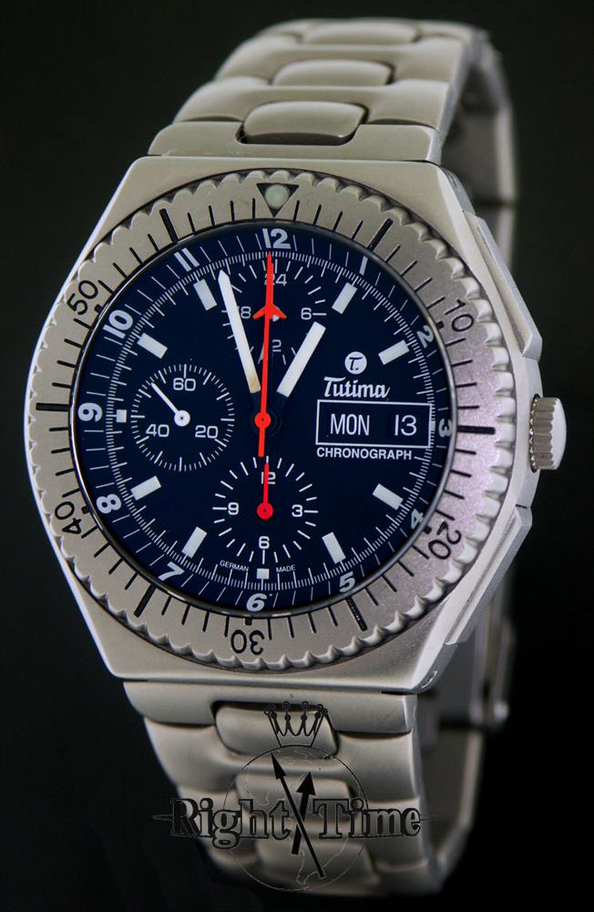 Tutima Military Air Force Chronograph 750-02 TL. Powered by legendary LEMANIA Cal. 5100 17 jewels Swiss Automatic movement with chronograph, military 24 hour format hand, Day/Date calendar functions. Pure titanium case with bi-directional rotating bezel and screw-down crown. Black dial with luminous hands and markers. Titanium watch bracelet with tri-fold deployment clasp with security flip-lock and over-the-wetsuit expansion. Water resistant to 200 meters.
