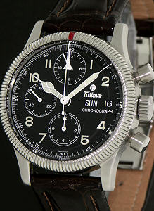 Tutima Flieger Chronograph F3 watch powered by Swiss Lemania 5100 Automatic chronograph movement with 24 hour hand, day and date indicators. Stainless steel case with bi-directional coin edge style rotating bezel and screw-down crown. Black dial with luminous hands and Arabic numerals. Brown leather watch band. Only 1 year old.