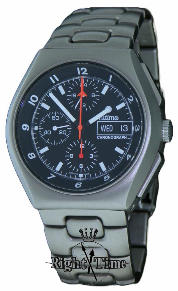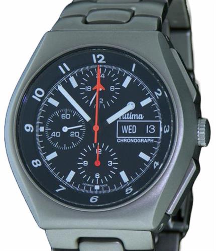 Tutima Military Air Force Chronograph T. This watch is powered by LEMANIA Cal. 5100 17 jewels Swiss Automatic movement with chronograph, military 24 hour format hand, Day/Date calendar functions. Pure titanium case with screw-down crown. Black dial with Arabic numerals, luminous hands and markers. Titanium watch bracelet with tri-fold deployment clasp with security flip-lock and over-the-wetsuit expansion. Water resistant to 200 meters.