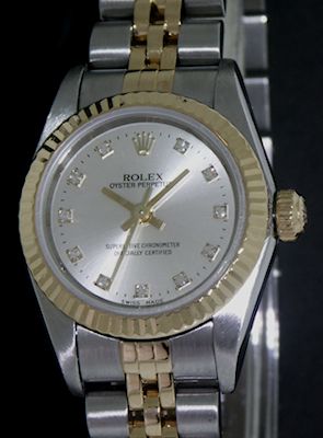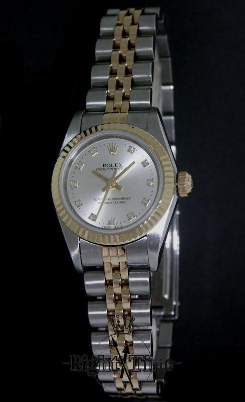 Ladies Rolex Oyster Perpetual Model 76193, 18kt gold and stainless steel case and band, slate grey factory diamond dial, sapphire crystal, box and papers.