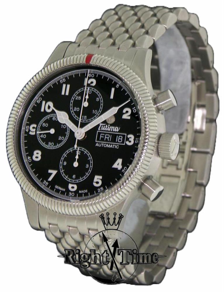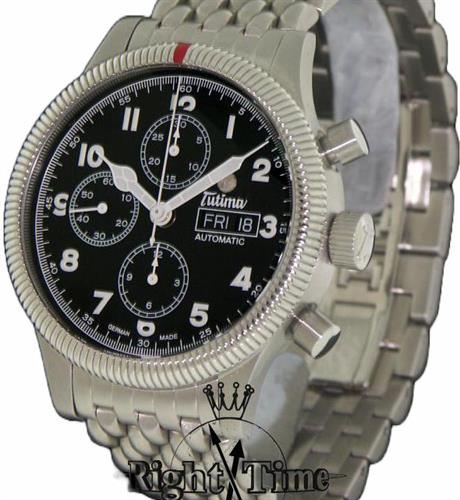 . Swiss Valjoux 7750 Automatic chronograph movement with day and date calendar. Stainless steel case with bi-directional coin edge style rotating bezel, screw-down crown and observation case back. Black dial with luminous hands and Arabic numerals. Stainless steel watch bracelet.