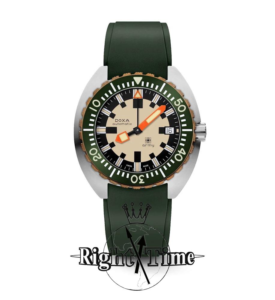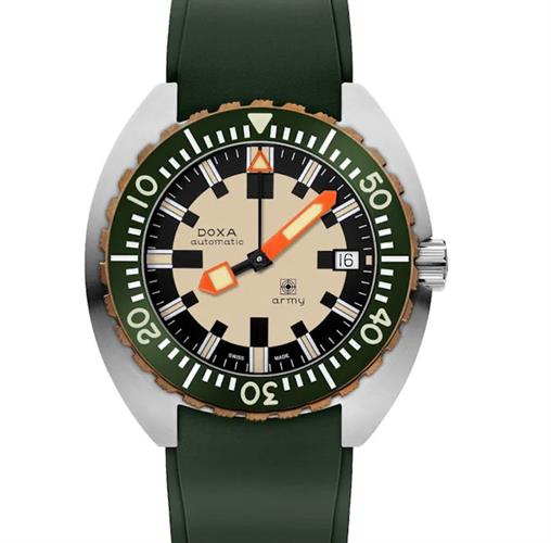 Doxa Army, stainless steel bronze bezel model 785.60.031.26. Water resistant to 300 meters. Watch is powered by Swiss mechanical automatic, self-winding movement decorated by Doxa. Beige and black dial with orange hands. Comes on a green rubber strap. An additional NATO camouflage strap is included. Special case features the original camouflage pattern of the field uniform worn at the time by the Swiss Army.