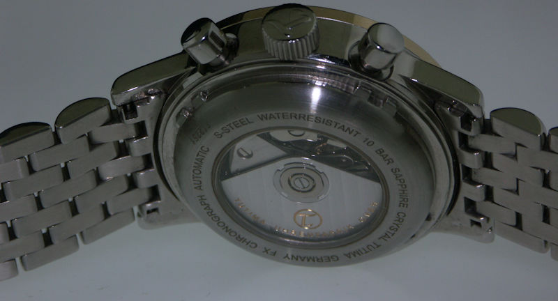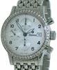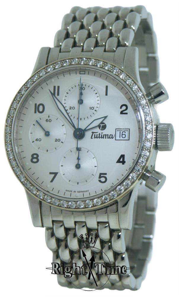 Tutima Pilot FX model 788-45. This rare customized version features a solid 18kt gold bezel covered with 52 hand-set diamonds (1.30ct). The brilliance of the diamonds is no lost in the case and bracelet, which is specially finished in a high gloss polish. White dial features printed Arabic numerals and luminous blued hands. Swiss made Valjoux 7750 automatic chronograph movement.