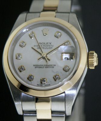 Ladies Rolex DateJust 79163 Swiss Automatic, 18kt yellow gold bezel, 18kt/ss oyster bracelet, Rolex original certified mother-of-pearl dial with factory diamond markers, serial number K1431**, 2001