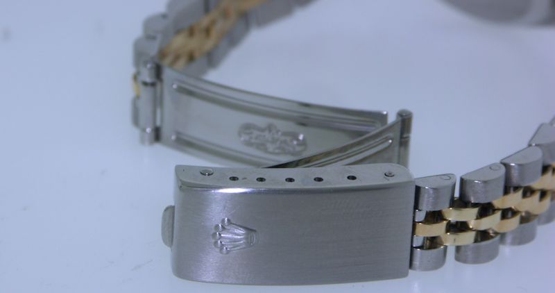 Jubilee style links. Solid Stainless steel and 18kt Gold combination. Combination satin/polished finish. Fits 7" wrist.