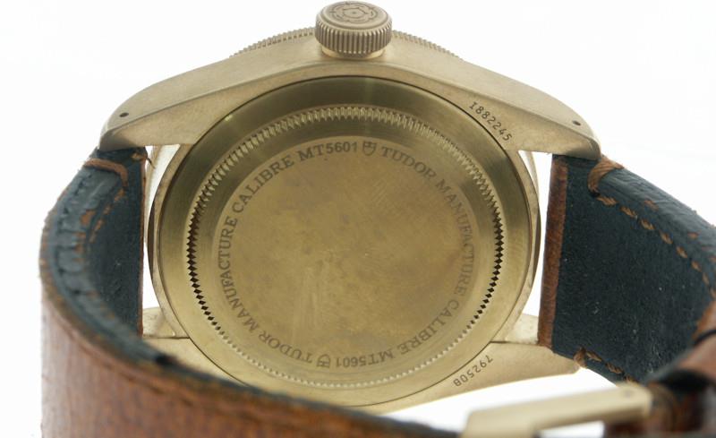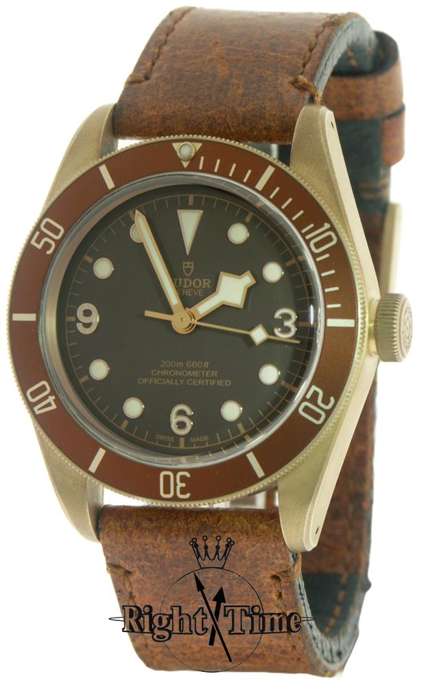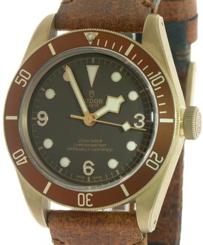 Tudor by Rolex "Black Bay" model 792508BM. Genuine bronze 43mm case. Swiss made Tudor Calibre MT5601 automatic movement. Uni-directional rotating bezel with brown color 60 minute insert. Brown dial with luminous hands and markers. Tan genuine leather strap with bronze tang style buckle.
