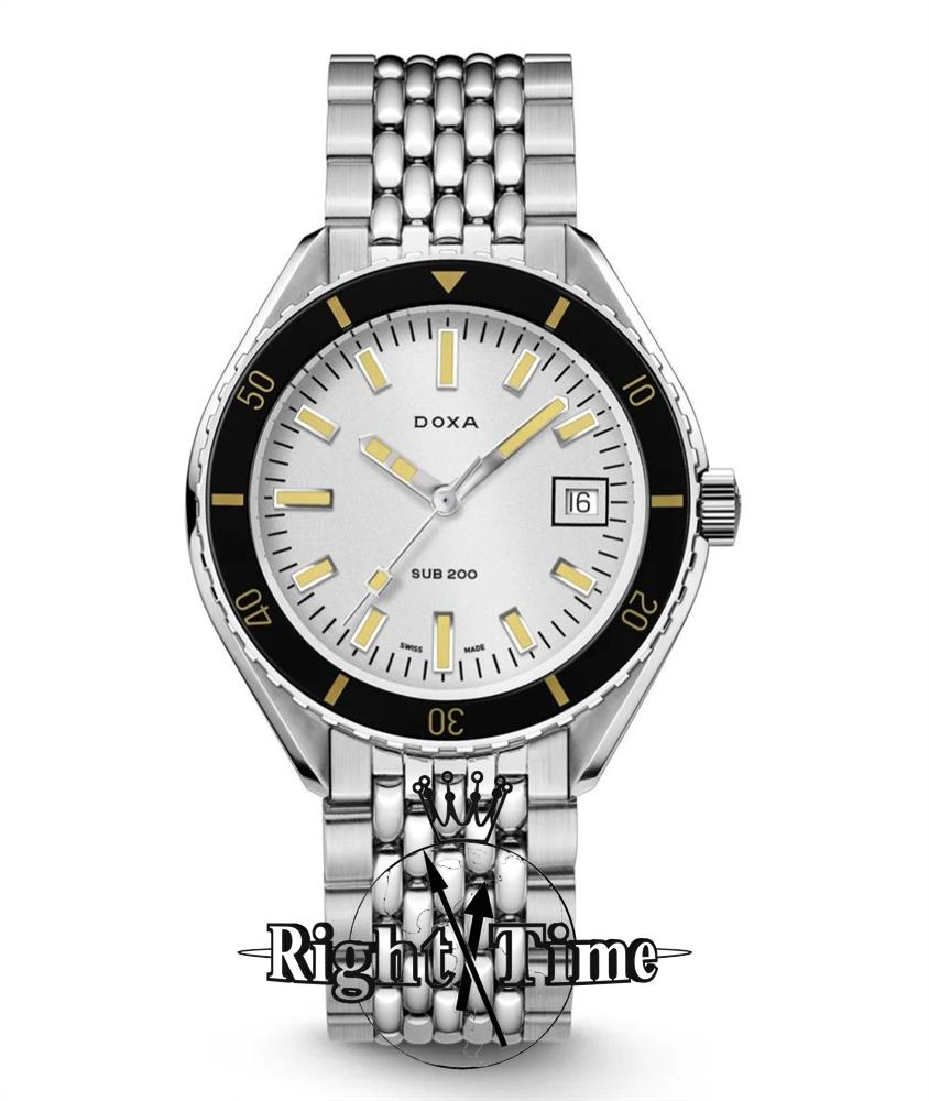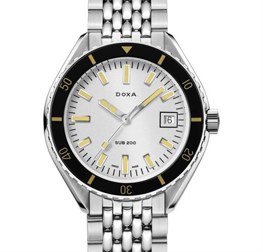 Doxa Sub 200 Searambler model 799.10.021.10. Water resistant to 200 meters. Watch is powered by Swiss mechanical automatic, self-winding movement decorated by Doxa. Black 0-60 bezel. Silver color dial with steel hands. Comes on a bracelet.