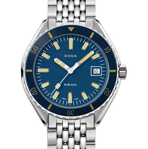 Doxa Sub 200 Caribbean model 799.10.201.10. Dive rated to 200 meters. Watch is powered by a Swiss mechanical automatic movement. Blue dial with luminous filled steel tone hands and markers. Solid stainless steel case with a beads-of-rice style steel bracelet. Domed sapphire crystal.