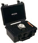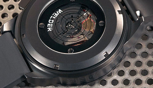 Welder K29 chronograph model 8002 with 3 time zones powered by 3 independent Miyota quartz movements FS10 / 2033 / 5Y20. Large 53mm black plated 316L stainless steel case with rubber watch strap. Black dial with red assents, date calendar and 24-hour hand. Water resistant to 100 meters.