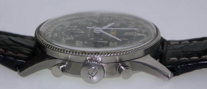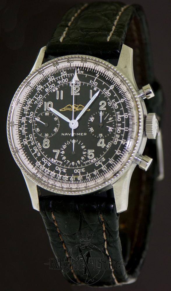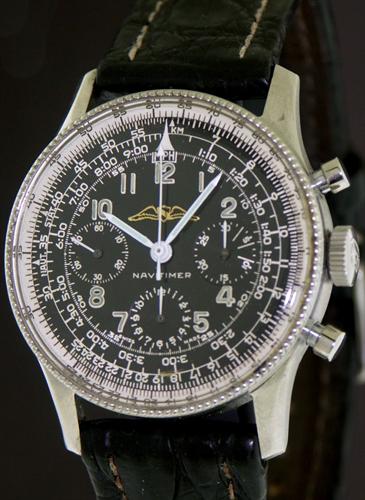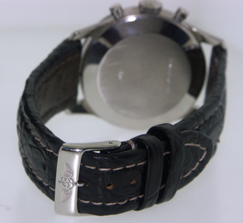 Breitling Navitimer with AOPA logo black dial Swiss made manual wind chronograph model 806 in all polished stainless steel case and heavy aviator style crocodile leather strap. Powered by famous 17 jewel Venus 178 movement.