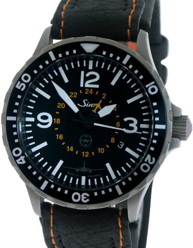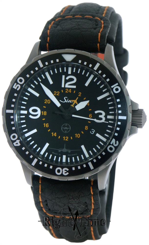 Sinn 857 UTC TESTAF LH Cargo. Collaboration celebrating the Lufthansa Boeing 777F cargo freighter, only 777 pieces were produced Worldwide. Tegimented stainless steel case. Swiss made ETA2893-2 automatic movement with date and second time zone function. Bi-directional bezel with black color 24 hour insert. Black dial with luminous hands and markers. Sapphire crystal. Black leather strap with orange stitching.