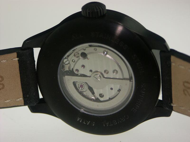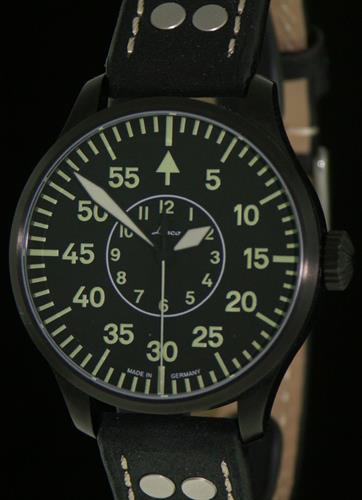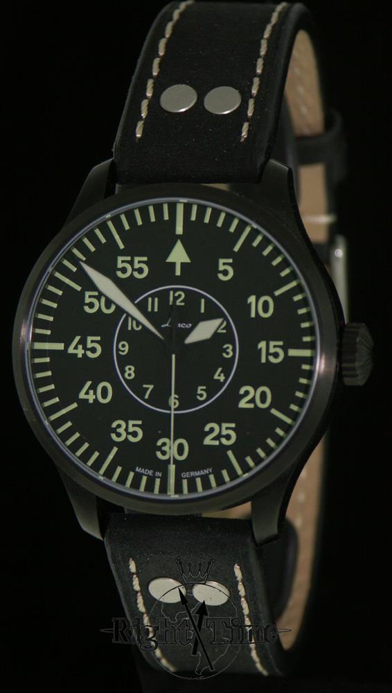 Laco Bielefeld 42 Pilot model 861760.2. Stainless steel case with black PVD coating. Black type b pilot style dial with luminous markers. Sapphire crystal. Laco 21 automatic movement (Miyota 821A).