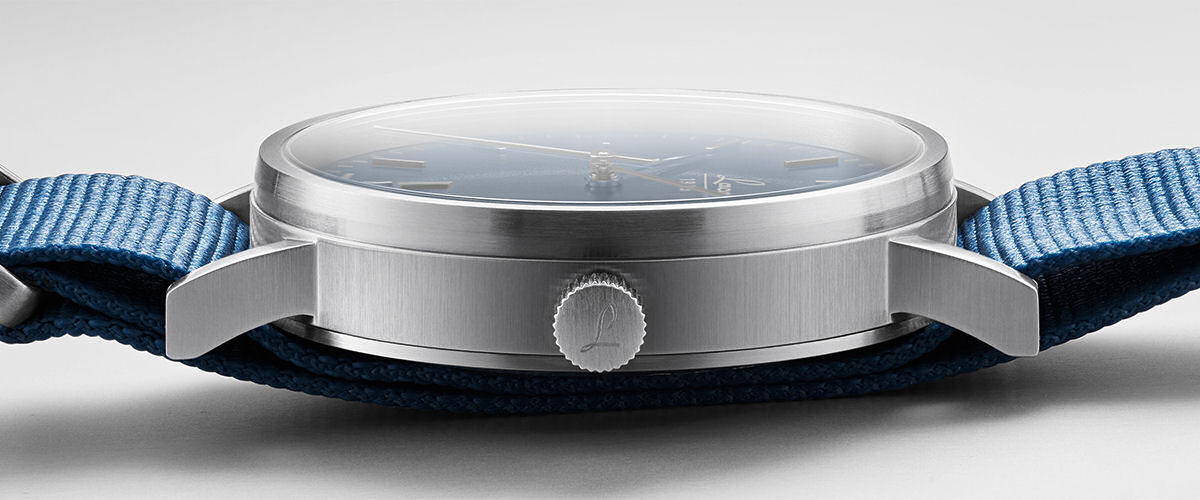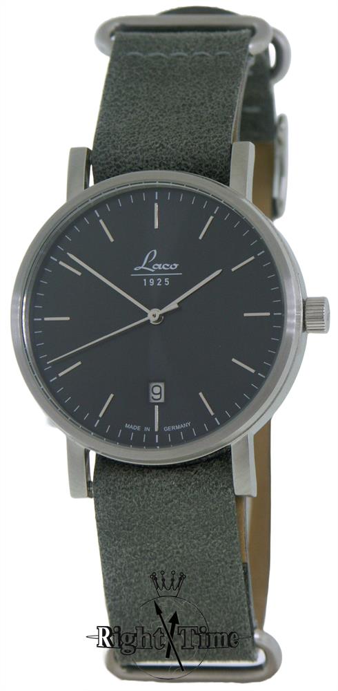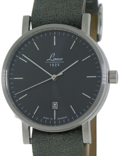 Laco Classics Stone 40mm watch model 862078. Powered by Miyota 9015 automatic movement. Stainless steel brushed case with gray dial. Arabic markers. Gray Nato style leather strap