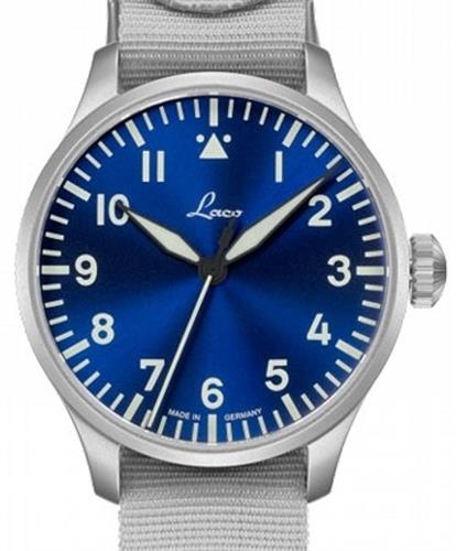 Laco Pilot Basic Pilot Augsburg Blaue Stunde model 86100. Sandblasted stainless steel case. Blue type a dial. Grey nylon NATO style strap. Powered by a Japanese made Miyota automatic movement. Sapphire crystal.