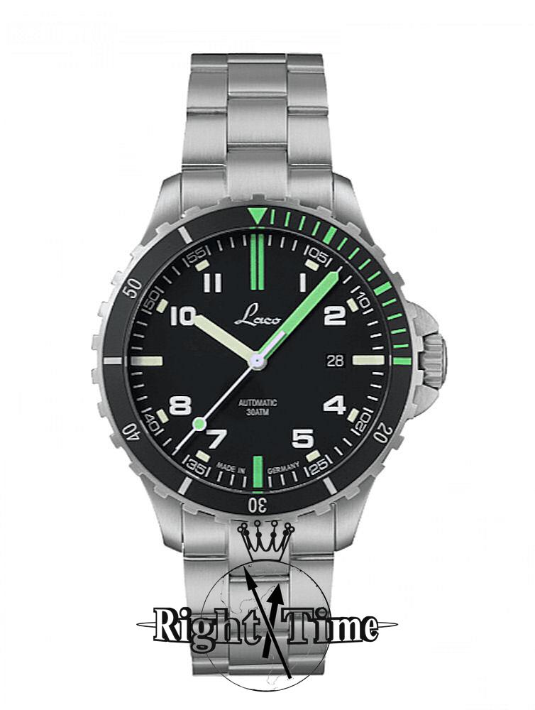 Laco Sport Amazonas model 862107.MB. Solid stainless steel case and bracelet. Black dial with green color accents. Powered by the Sellita SW200 automatic movement. Water resistant to 300 meters. Sapphire crystal.