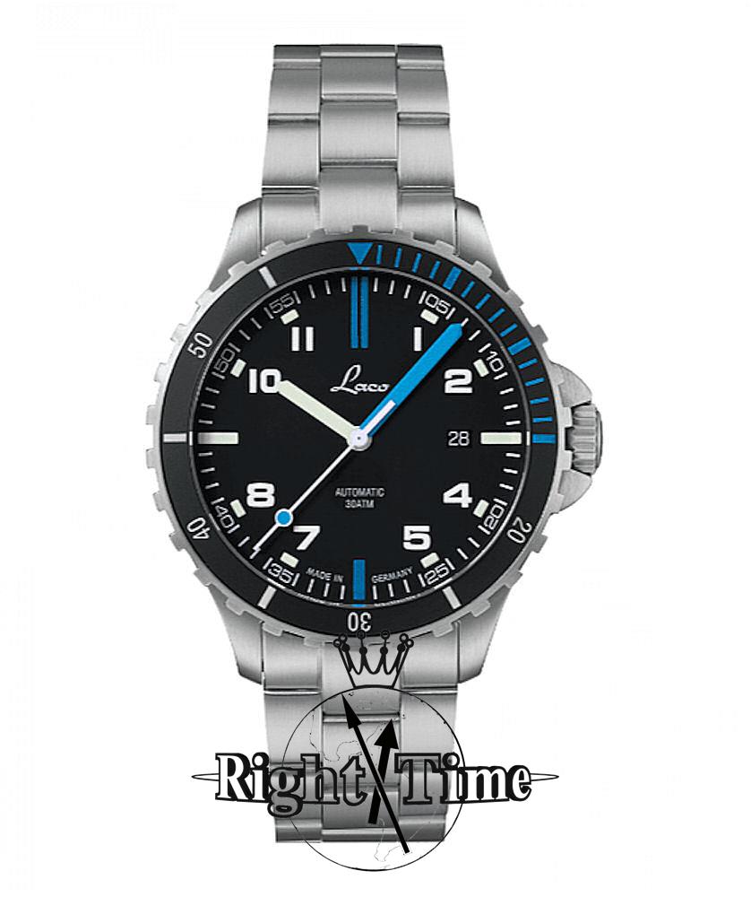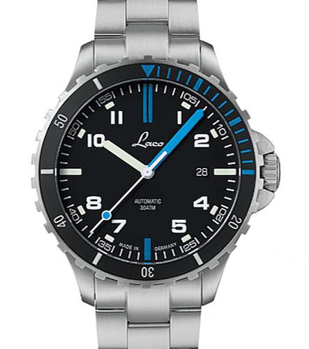 Laco Sport Watch Atlantik MB model 862108.MB. Stainless steel case and bracelet. Black dial with blue accents. Powered by ETA2824 automatic movement. Water resistant to 300 meters
