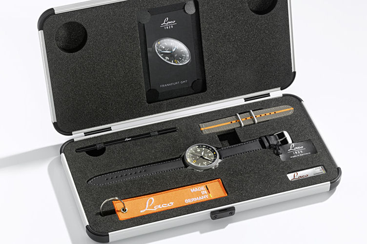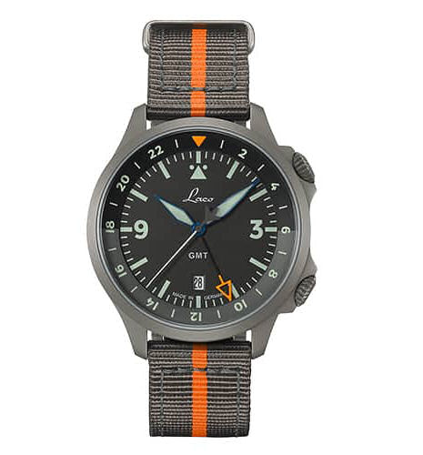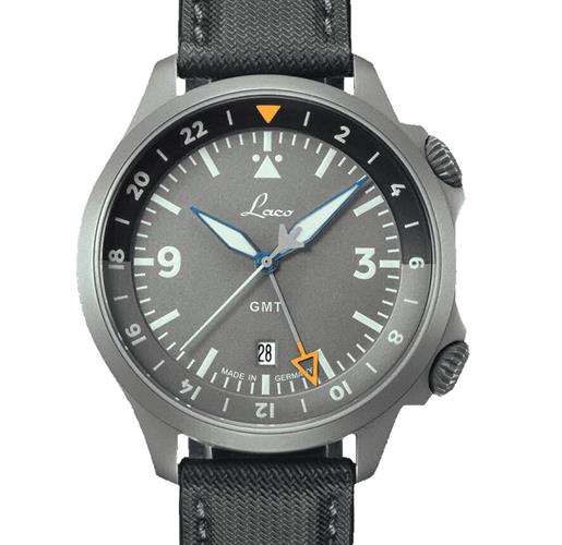 Laco Pilot Watches Special Models FRANKFURT GMT GRAU 862121. Steel case with leather band. Grey dial. Powered by automatic winding movement. Water resistant to 200 meters
