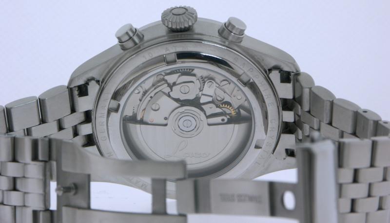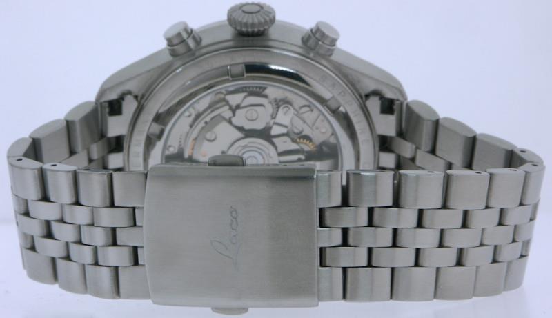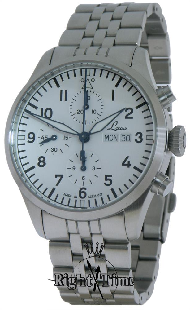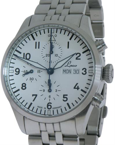 German made Laco pilot chronograph model KIEL.2 WEISS 862153. Satin finish all stainless steel case and bracelet. White pilot dial. Powered by automatic winding chronograph movement Sellita SW 500 with double calendar.