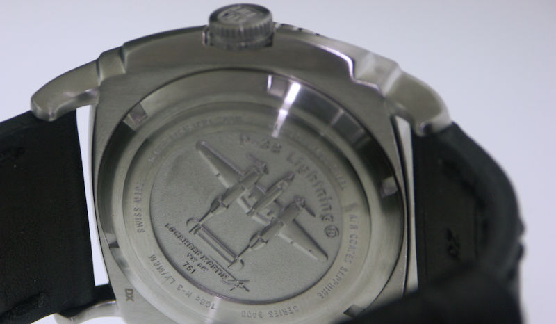 Luminox P-38 Lightning model 9401. Swiss made automatic movement. Extra large 48mm stainless steel case on heavy duty black leather strap. Black dial with cream Arabic numerals and tritium tubes. Uni-directional black bezel with 0-60 minute scale.