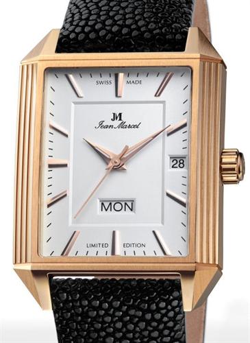 Jean Marcel QuadrumII watch model 970.265.52. Limited Edition of 300 pieces. Powered by ETA based 2836 automatic movement. Stainless steel rectangular rose gold plated case with observation back. White dial with day/date calendar. Non-reflective sapphire crystal. Black stingray leather strap. Water resistant to 50 meters