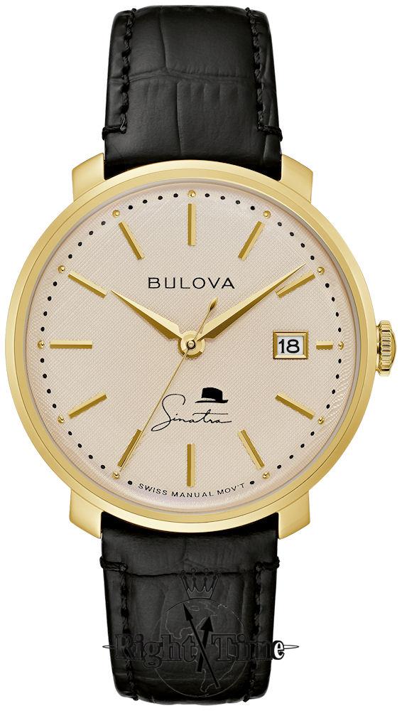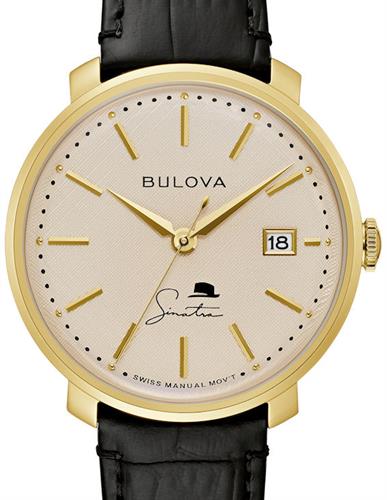 Bulova Frank Sinatra "The Best is Yet to Come" Collection. Model 97B195. Powered by Sellita SW215 manual wind movement. Gold plated stainless steel case with leather band, cream color dial, open case back.