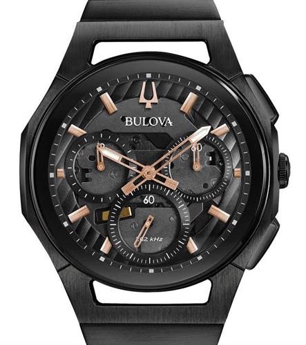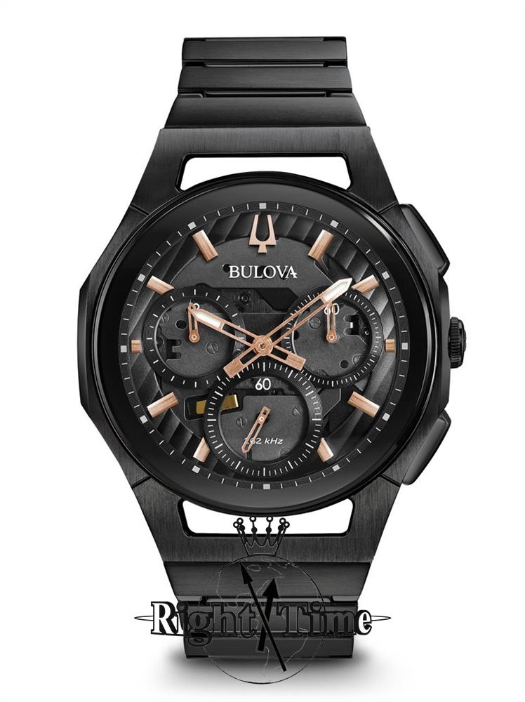 Bulova Men`s Curv chronograph watch. Model 98A207. High Performance Quartz Curv Chronograph movement. Black IP-plated stainless steel case and bracelet. Curved sapphire crystal. Black dial