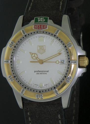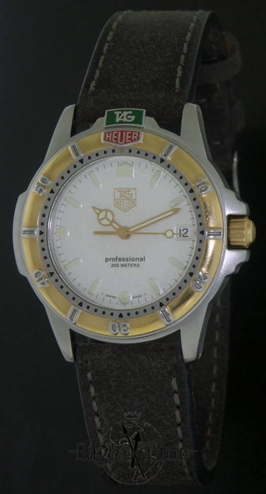 Tag Heuer "4000" Professional model 995.706K stainless steel case with gold plated rotated bezel, white dial with tritium filled markers and hands on leather strap