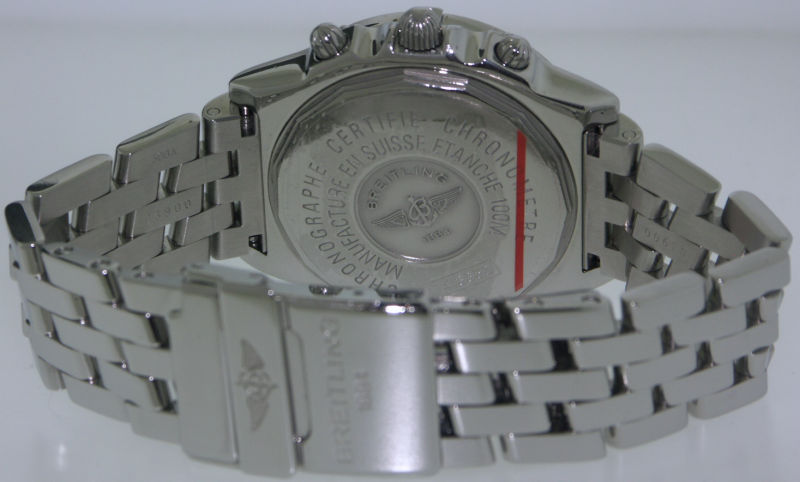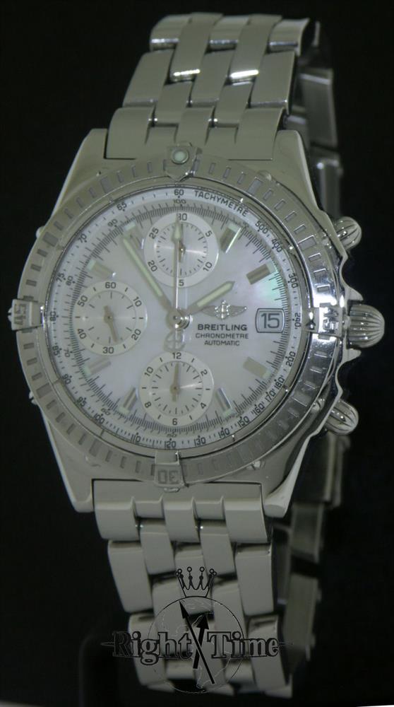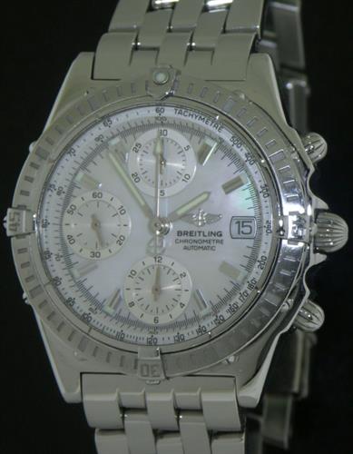 Breitling all polished "Windrider Chronomat" with Crosswind style bracelet, mother-of-pearl dial with silver sub-dials, powered by an ETA Cal.7750 Calibre 13, 25 jewels Swiss Automatic COSC chronograph movement with date, factory box and papers.
