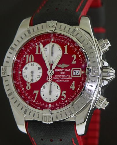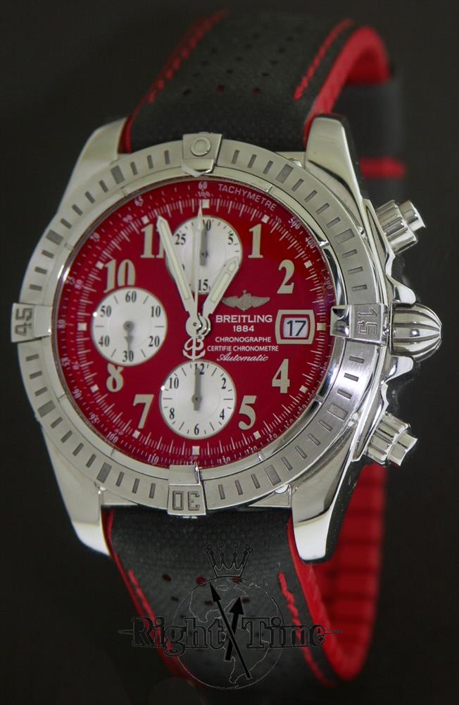 Breitling polished steel "Windrider Chronomat Evolution" with bright red dial on Hirsch genuine rubber strap, ETA Cal.7750 Calibre 13, 25 jewels Swiss Automatic COSC chronograph movement with date, factory box and papers.