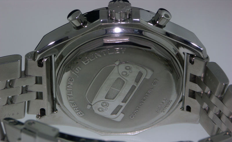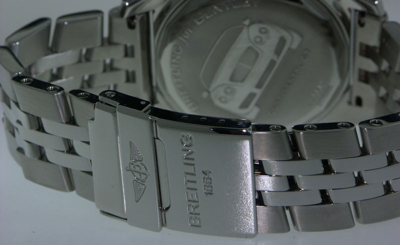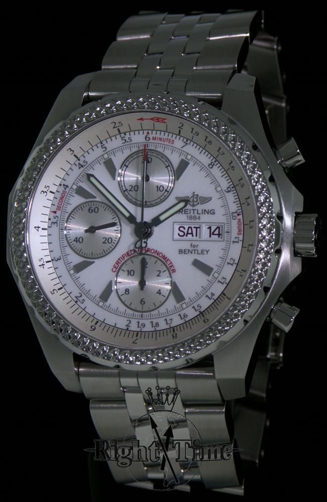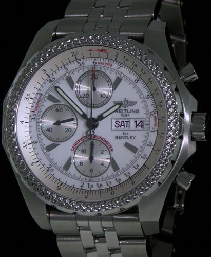 Breitling for "Bentley Motors" GT Racing edition model A1336313/A575. Powered by the Breitling Calibre 13B automatic movement, featuring day/date, 12hr/30min/60sec chronograph, and COSC chronometer precision. All stainless steel case and bracelet with sapphire scratch resistant crystal. White dial with silver color sub-dials. Luminous hands and markers.