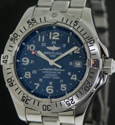 Breitling "SuperOcean" Swiss made automatic 1500m divers model with blue dial, solid stainless steel case with helium escape valve, stainless steel metal band, box and papers.
