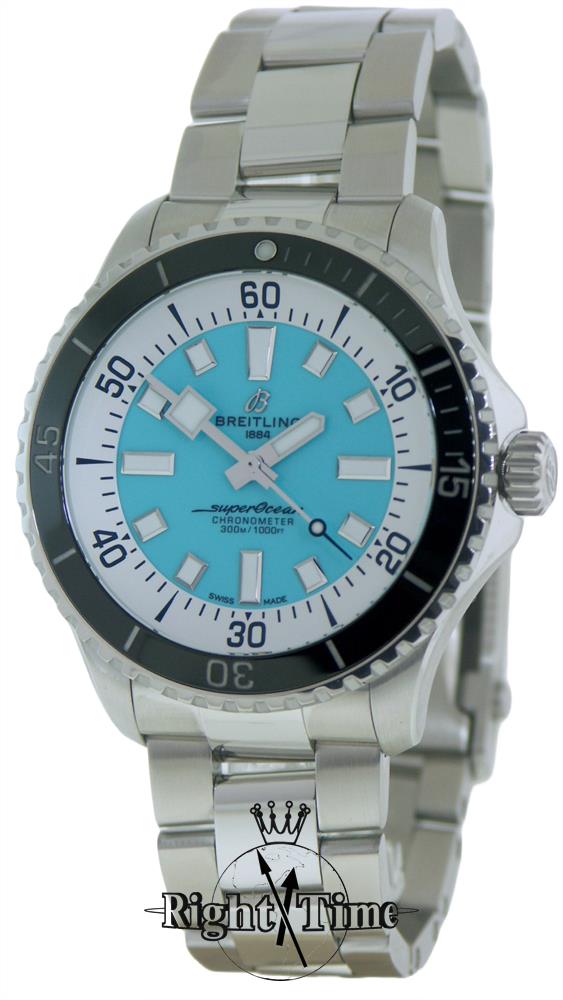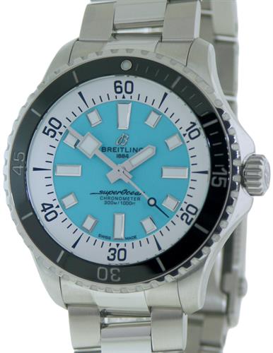 Breitling Superocean model A17376211L2A1. Solid stainless steel case and bracelet. Breitling Caliber 17 automatic movement. COSC certified chronometer. Turquoise blue dial with luminous hands/markers. Uni-directional bezel with black ceramic insert. Water resistant to 300 meters. Sapphire crystal.