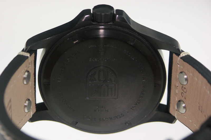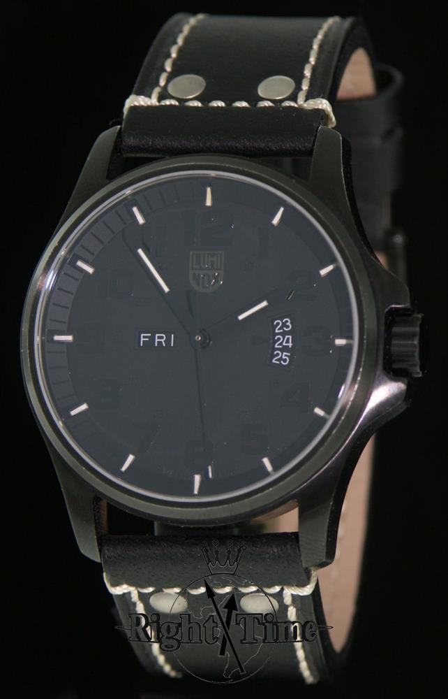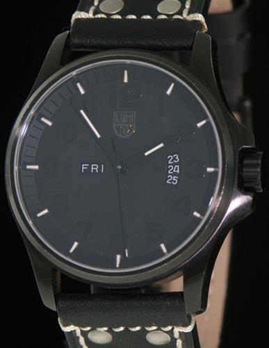 Luminox Field Blackout 47mm A1879.BO. Swiss quartz movement with day/date calendar. Stainless steel case with black PVD treatment on a black leather strap with steel rivets. Sapphire crystal, 100 meters water resistant. Black dial with black numerals and tritium micro gas lights on hour markers and hands.