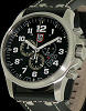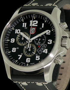 Luminox Field Chrono Alarm watch. Swiss quartz chronograph movement with alarm and date calendar. Large 47mm stainless steel watch on leather strap. Sapphire crystal, 100 meters water resistant. Black dial with micro gas lights on hour markers and hands.