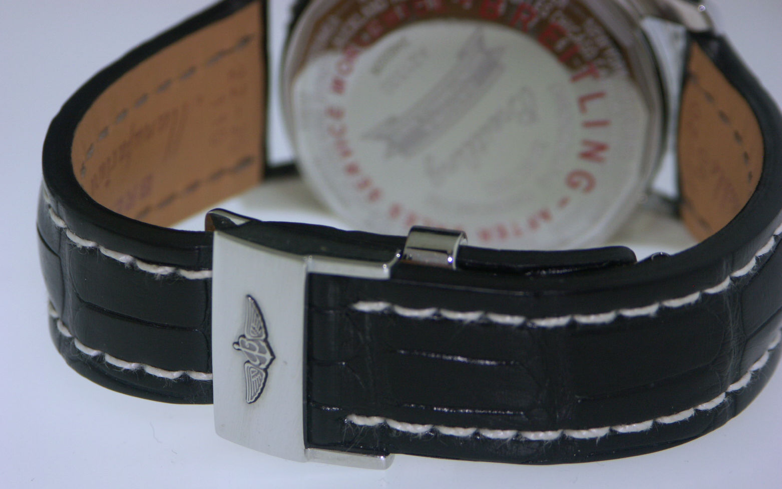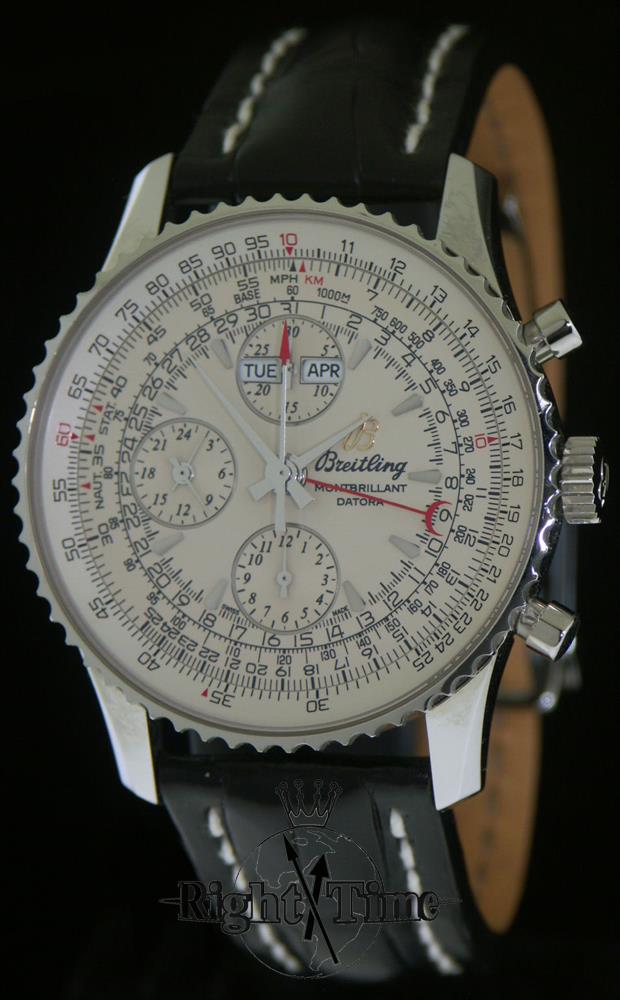 Breitling Montbrillant Datora model A21330. High polished stainless steel case on a black heavily padded Alligator strap with white stitching. Breitling Calibre B21 Automatic triple date chronograph. Beautiful Ivory dial with polished steel hands & markers. E6B slide rule smooth rotating bezel. Slightly domed sapphire crystal.