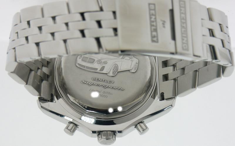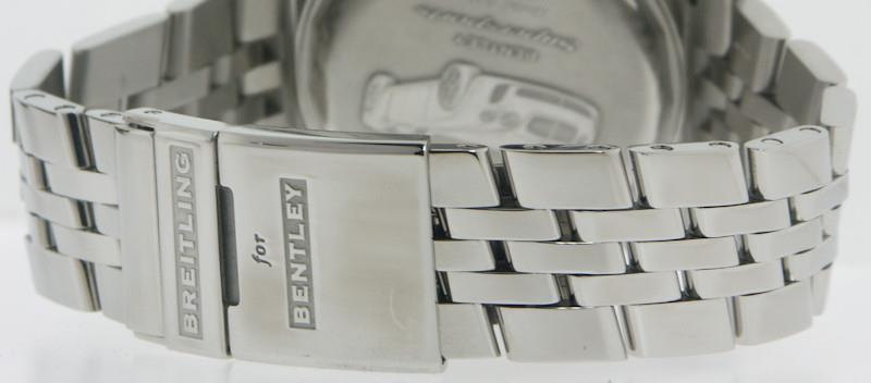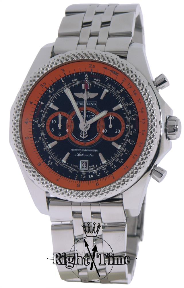 Breitling Bentley Supersports model A26364. Breitling Caliber 26B automatic chronograph movement. Polished solid stainless steel case and bracelet. Black dial with orange accents. Orange color inner rotating slide rule. Water resistant to 100 meters. Sapphire crystal with anti-glare coating.