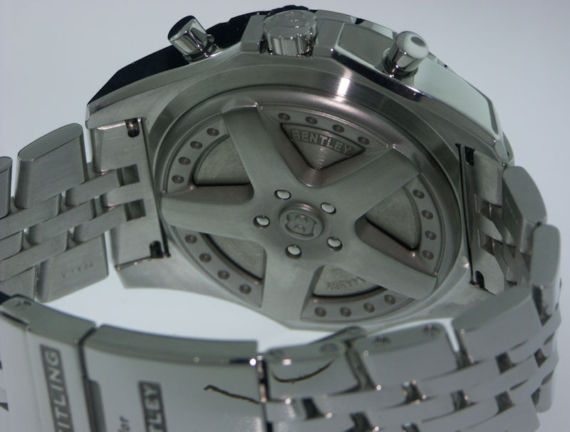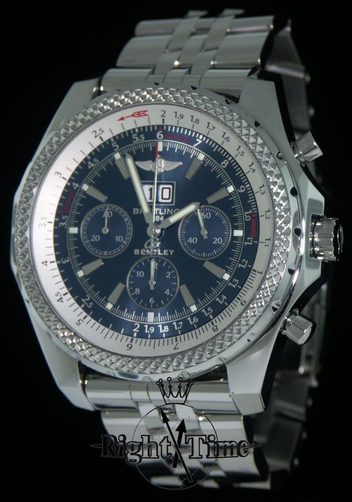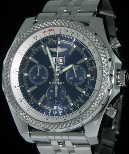 Breitling Bentley Motors 6.75 Edition. Breitling Caliber 44B automatic chronograph movement with big date function. High polish finish 49mm stainless steel case and bracelet. Blue dial with polished steel markers and hands. Inner rotating slide rule. Water resistant to 100 meters. Sapphire crystal with anti-glare coating.