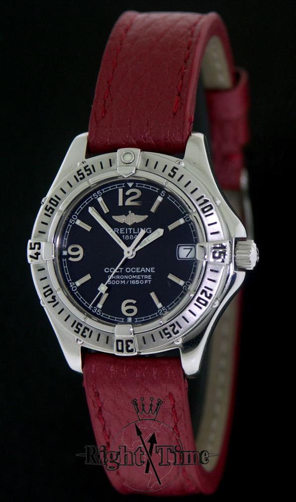 Breitling 34mm "Colt Oceane" Swiss made quartz model with date. Water resistant to 500 meters. Stainless steel case with 0-60 rotating bezel and leather band