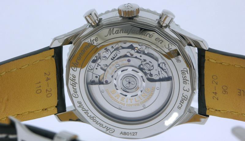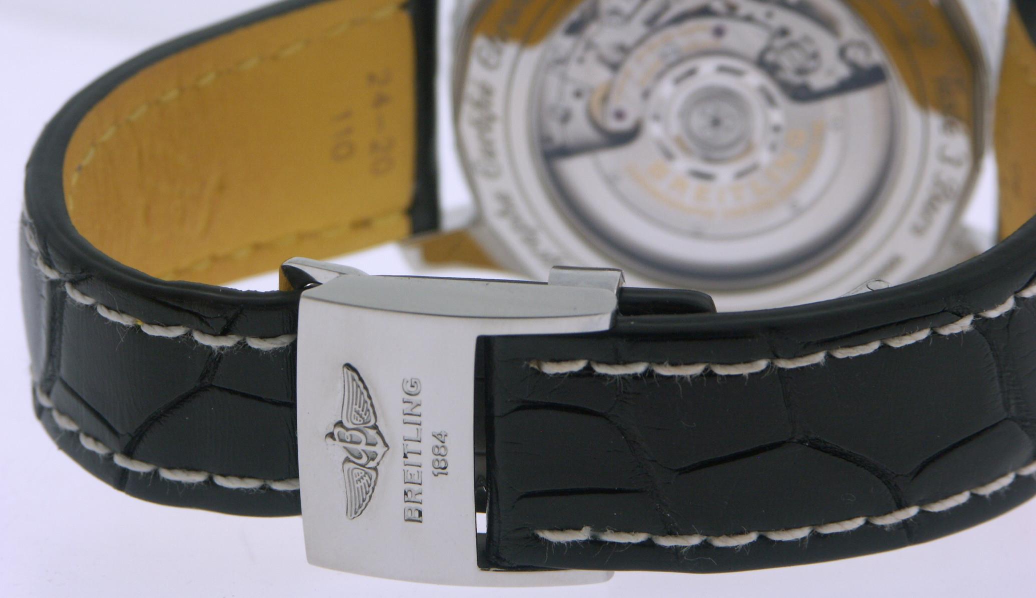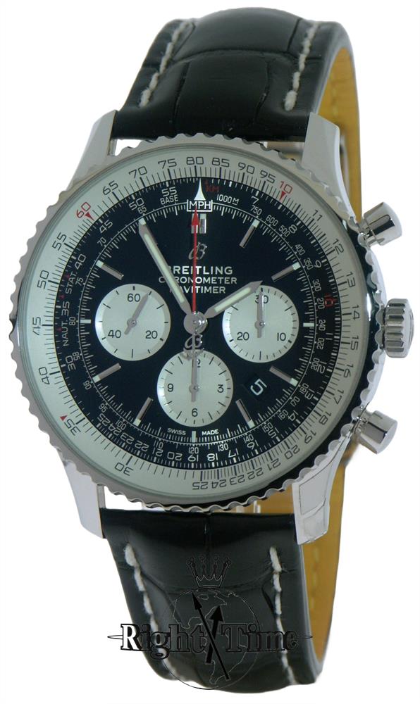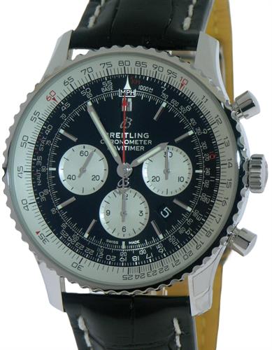 Classic Breitling Navitimer 01 model AB0121211B1A1. Swiss made automatic Breitling Caliber 01 chronograph with calendar movement, black/silver dial. Highly polished 46.00mm stainless steel case on black alligator strap with deployant clasp. Black dial with silver tone sub-dials & bezel ring. Sapphire slightly domed crystal.