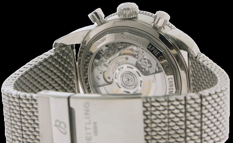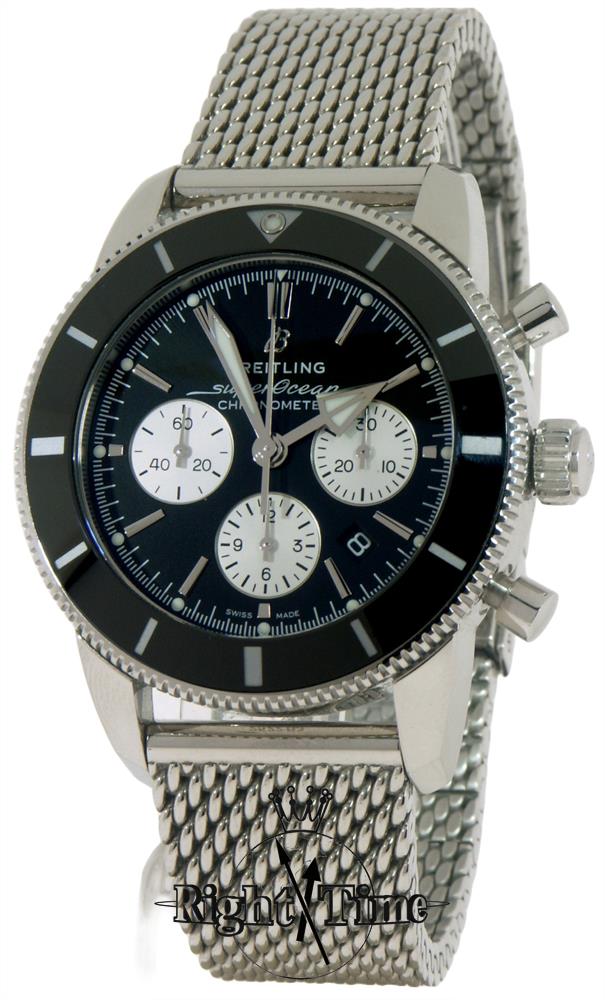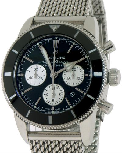 Breitling Superocean Heritage model AB0162121C1A1. Swiss made automatic Breitling Caliber 01 automatic movement with chronograph and date functions. COSC certified chronometer. Polished stainless steel case on mesh bracelet. Black dial with silver color sub-dials. Uni-directional bezel with black ceramic 60 minute insert. Sapphire crystal. Water resistant to 200 meters.