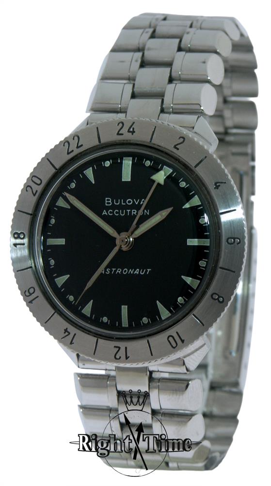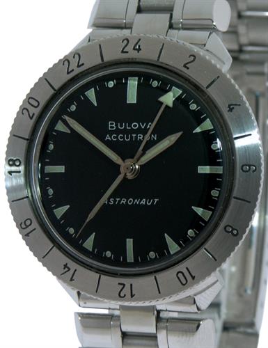 Bulova Accutron Astronaut powered by Cal.214 Bulova tunning fork movement, black dial with tritium luminous filled markers and hands, on factory original metal bracelet