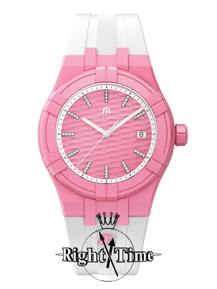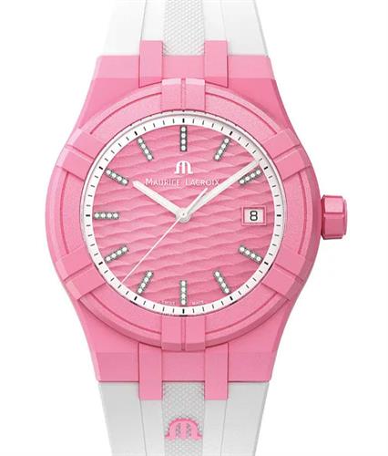 Maurice Lacroix Aikon #tide watch model AI2008-EEEE1-3A0-0. Swiss quartz movement. Pink textured dial with diamond markers, luminous hands, "vagues du Jura" finish, and date calendar. The bezel, case, case back, crown, end-piece and buckle on this new model are all made from ocean-bound upcycled plastic composite material. It takes 17 bottles to make one fabulous watch and its tailor made packaging, 100% made of #tide ocean material. White rubber band. Water resistant to 100 meters.