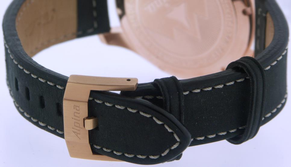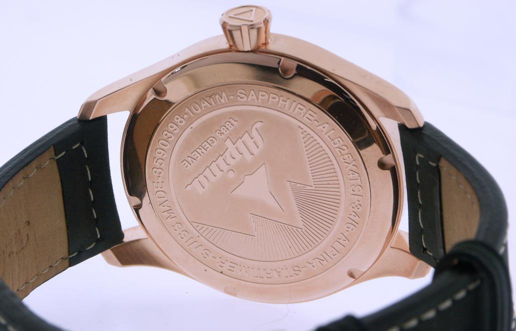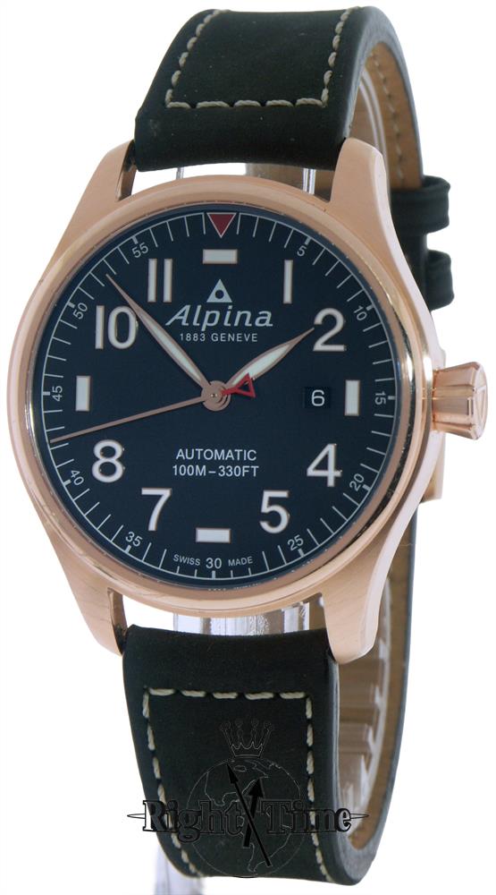 Alpina Startimer Pilot model AL-525G3S4-SR. Rose gold tone stainless steel case. Alpina Calibre AL-525 Automatic movement (base Sellita SW200-1). Black dial with rose gold tone hands and markers. Sapphire crystal. Black leather strap with white stitching. Water resistant to 100 meters.