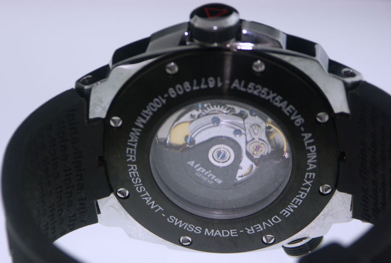 Presenting the "Extreme Diver" from Alpina. Solid stainless steel case, with black PVD treated ratcheted diver bezel. Rated to 1000m water resistant! Driven by a highly decorated Alpina AL-525 movement, presented through an observation crystal on the caseback. Other features include a sapphire crystal, helium release valve, and a black silicone strap with a deployment clasp. Factory model AL-525BB5AEV6.