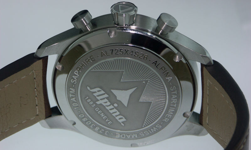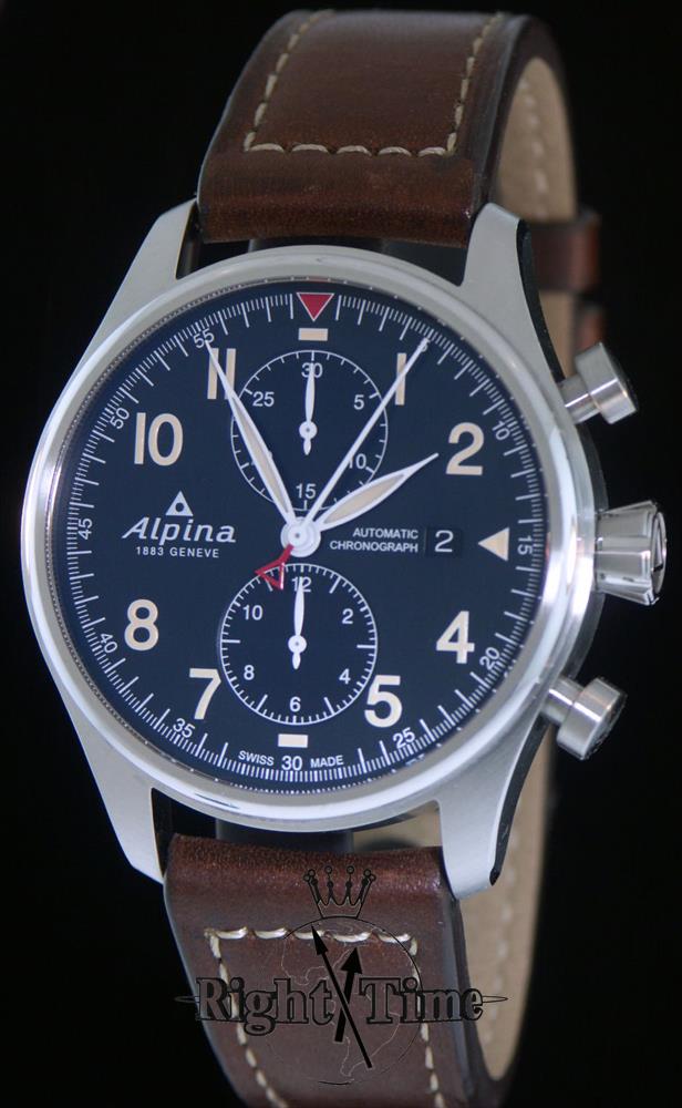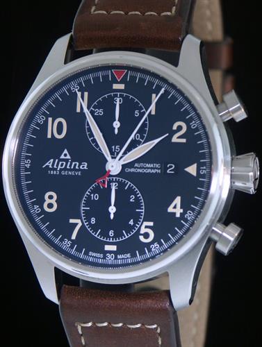 Startimer Pilot Chronograph model AL-725N4S6. Swiss automatic chronograph movement. "Bi-Compax" Chronograph Layout. Stainless steel case with leather strap. Engraved case back. Sapphire crystal. Navy blue dial. 100 meters water resistant.
