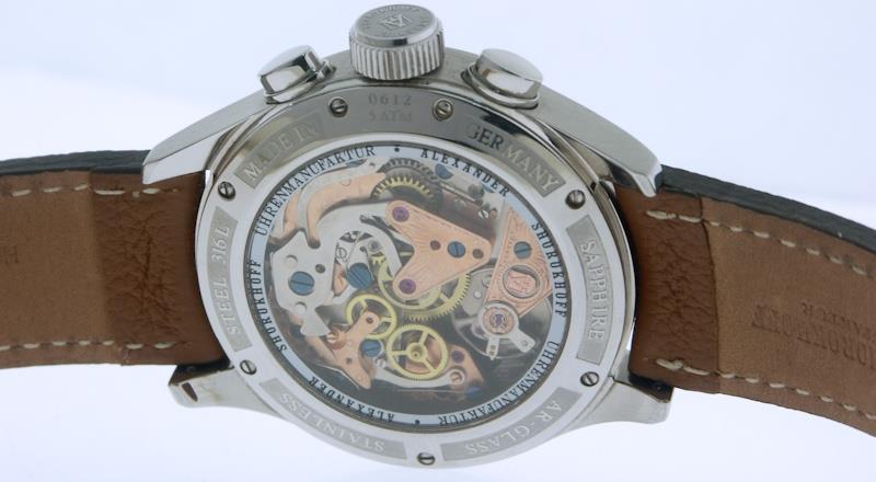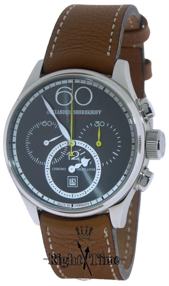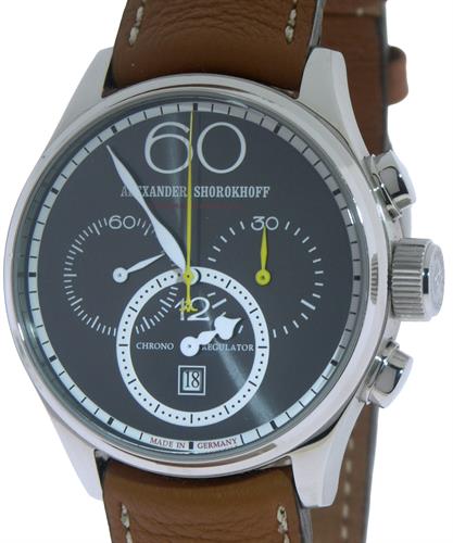 Alexander Shorokhoff model AS.CR01-3. Russian made Poljot Caliber 31679 manually wound movement with date, chronograph, and regulator functions. Solid stainless steel case. Domed sapphire crystal. Grey color dial with white and yellow hands. Tan leather strap.