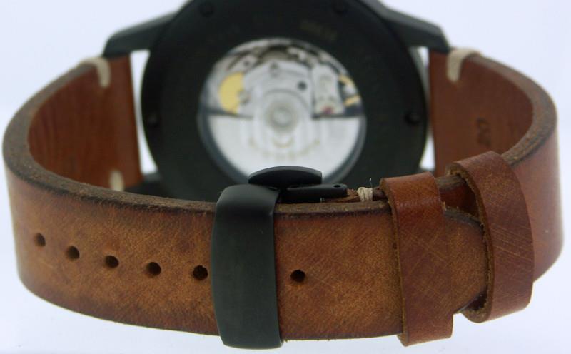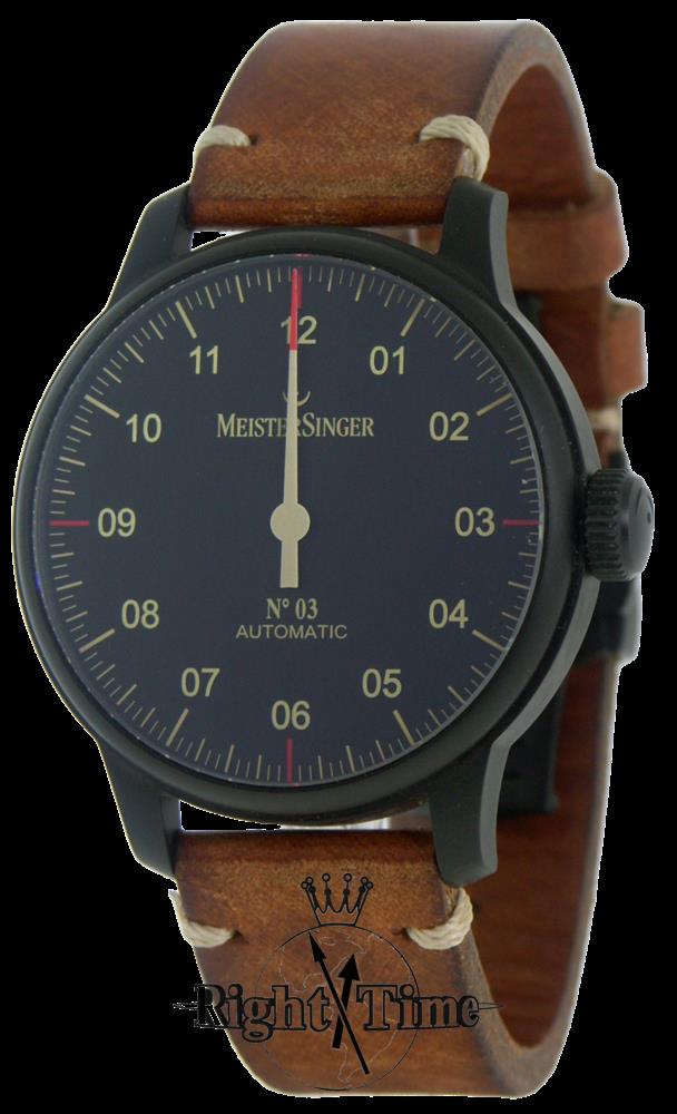 Meistersinger N03 Black Line model AM902BL. Swiss made automatic movement with single hand timekeeping. Black DLC case on a vintage style tan leather strap. Black dial with khaki colored accents. Sapphire crystal.