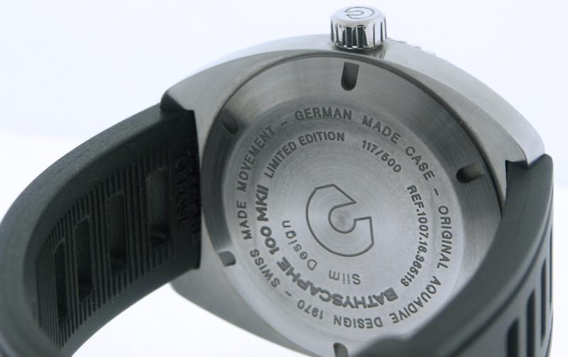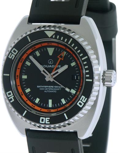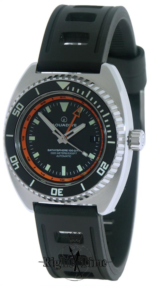 Aquadive Bathysphere 100 GMT model 1007.16.365113. Powered by Original Swiss made ETA 2893-2 automatic movement with date and second time zone functions. Solid 316L surgical stainless steel case with uni-directional bezel. Black dial with orange inner 24 hour chapter ring. Black genuine rubber strap.