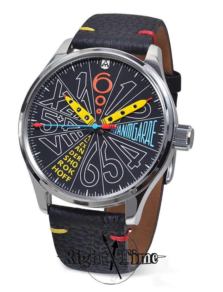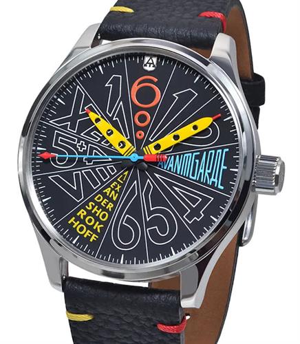 Alexander Shorokhoff "Avantgarde 08" Limited Edition of 50 pieces. Bold color combinations. The three main colors used in this watch are orange, yellow and blue – each color brings a certain contrast to the black background and creates a certain emotionality. Powered by hand-wound 2614.AS caliber movement with hand engraving and finishing in steel case with black leather band.
